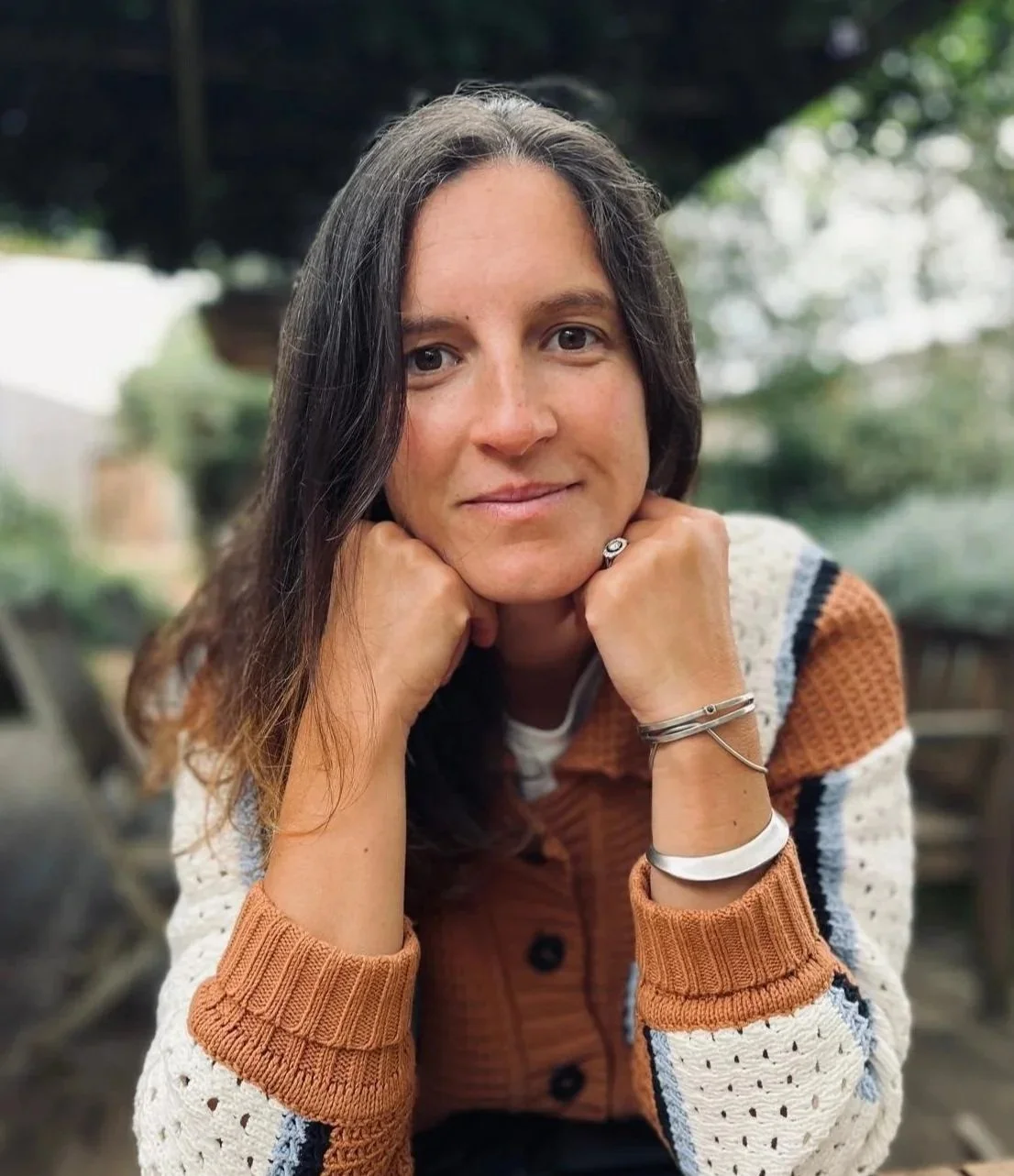 Jeune femme avec cheveux longs, portant une veste à manches longues colorée, posant avec le visage soutenu par ses mains, en extérieur, fond flou avec de la verdure.